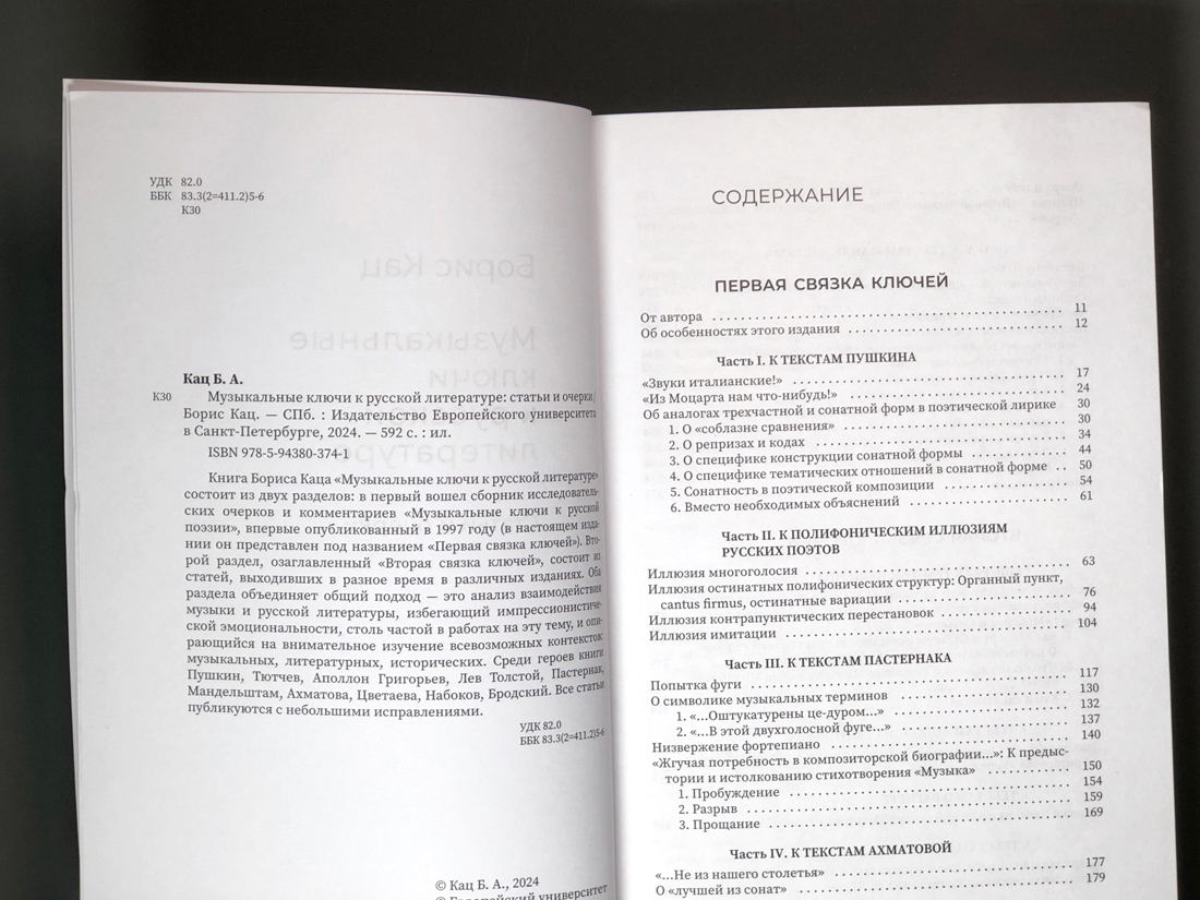 Взаимодействие музыки и русской литературы — одна из главных тем научных работ Бориса Ароновича Каца (р. 1947), автора 10 книг (среди них антология «Музыка в зеркале поэзии» в трех выпусках) и более 150 статей о проблемах теории и анализа музыкальных и словесных текстов XVIII?XX веков. С конца прошлого века ученый и педагог тесно связан с Европейским университетом в Санкт-Петербурге: в 2000 году он стал деканом-организатором и профессором факультета истории искусств. Он также был приглашенным профессором в Иллинойском и Мичиганском университетах, выступал с лекциями в других университетах США, Европы и Азии. В сборник Бориса Каца «Музыкальные ключи к русской литературе» вошли работы разных лет, объединенные общим подходом — анализом взаимовлияния музыки и литературы. Названия многих статей имеют вопросительную форму: «Какую музыку слышал во сне Стива Облонский?»; «Кто первым начал „Крейцерову сонату“?»; «Песенка о еврейском музыканте: шутка или кредо?»; «Какому Брамсу готов был сдаться Пастернак?» На эти и многие другие вопросы автор дает ответы — зачастую неожиданные, но всегда обоснованные и убедительные. Среди героев книги Пушкин, Тютчев, Аполлон Григорьев, Лев Толстой, Пастернак, Мандельштам, Ахматова, Цветаева, Набоков, Бродский.