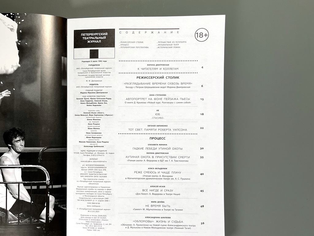 В этом номере (его оформил сценограф Константин Соловьев) мы провожаем Юрия Бутусова и Боба Уилсона, беседуем с Петром Шерешевским и разбираемся с «Утиными охотами», с «Обломовыми», «Горем от ума», «Гамлетом», «Театральным романом», «Сестрой печали», «Соловками», «Чижом и Ежом», «Тремя мушкетерами», с режиссерами Федоровым и Праудиным, Габриа и Егоровым, Прикотенко и Мульковым, Абулкатиновым и Крымовым, пишем о лабораторном движении, зародившимся в России и пересаженном на европейскую почву…